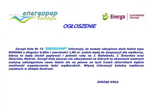 Zarząd Koła nr 72 "Energopap" informuje, że zostały zakupione dwie łodzie typu Romana o długości 4,00 m i szerokości 1,80 m.
