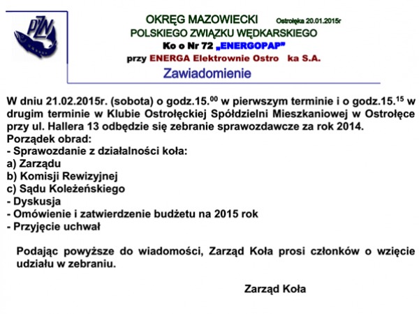 W sobotę 21 lutego w pierwszym terminie o godz. 15.00 i w drugim terminie o godz. 15.15 w Klubie Ostrołęckiej Spółdzielni Mieszkaniowej przy ul. Hallera 13 odbędzie się zebranie sprawozdawcze za rok 2014.