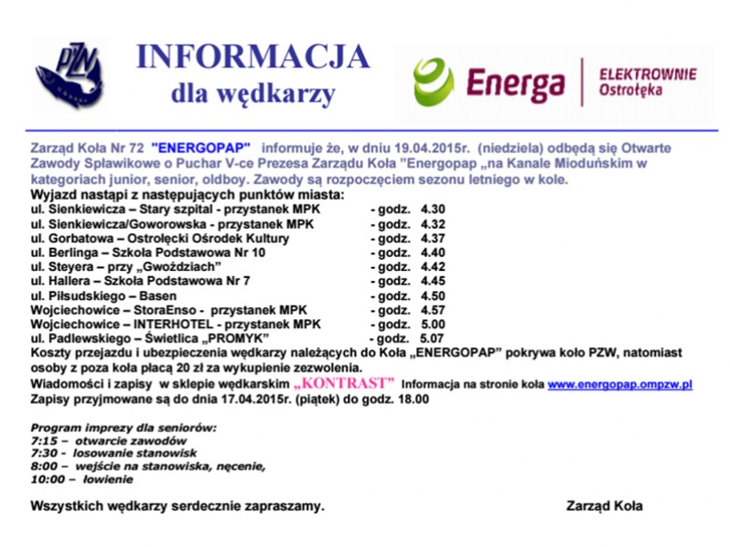 Zarząd Koła nr 72 "Energopap" informuje, że w niedzielę 19 kwietnia odbędą się Otwarte zawody spławikowe o puchar v-ce prezesa Zarządu Koła "Energopap" na Kanale Mioduńskim w kategoriach junior, senior, oldboy.