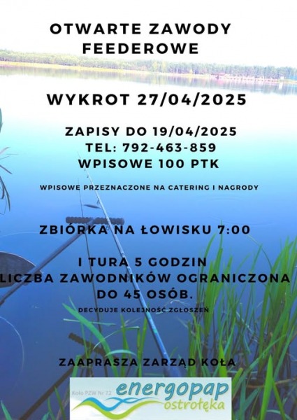 27 kwietnia zapraszamy wszystkich wędkarzy na Otwarte zawody feederowe, które odbędą sie na zbiorniku Wykrot.
